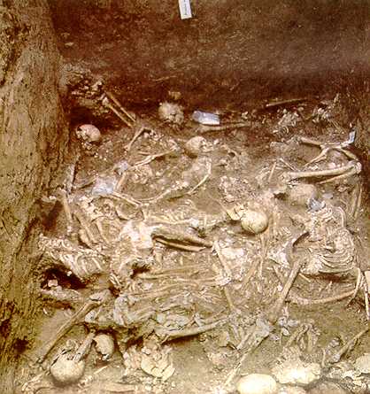 A hundred and twenty men, women and children were buried in the 4th c. BCE in a common grave in Pydna, North Greece. Some of the skeletons bore fetters around their hands, lower legs and necks which may imply that they were slaves. However, archaeologists are not in a position to offer more substantial information at this point.