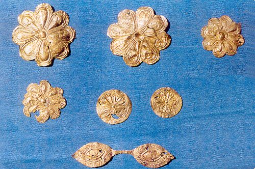 The Greek archaeologists Anastasia and Pavlos Chrysostomou have been excavating ancient graves at Archontikon in the area of Pella, Macedonia, Greece since 1998. The necropolis (cemetery) had been in continuous use from the Iron Age (c1000 BCE) to the early Hellenistic (c280 BCE). However, last summer (2002) the Greek archaeologists focused on graves of Macedonians dating to the mid 6th c. BCE. The discoveries have been astonishing: the plain box like graves revealed a great number of silver and gold items.