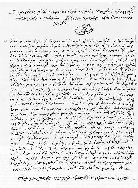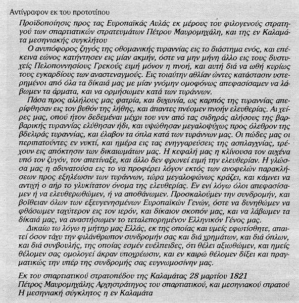 The first official document of the Greek War of Independence was sent by the Messenian Senate to the European powers in March 1821. It was a declaration signed by the head of the Greek army in Kalamata, Petrobeys Mavromichalis. The Greeks made known to Europe that they would fight for their freedom until death. The document was entitled "Warning Towards the European [Royal] Courts..."