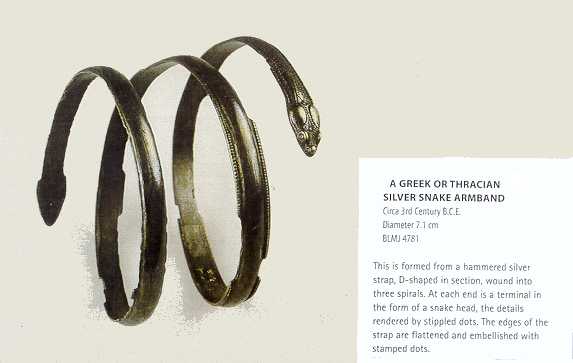During ancient times, there was an infinite array of jewelry forms that were produced in Greece. Beaded necklaces were often with gold decorative clasps with loops and hooks. Earrings were crafted in the form of hoops with animal heads such as a bull or lion. Bracelets were usually in the form of a snake, coiled in a spiral. Finger rings, both with settings of gold or silver, and inlaid with precious and semi-precious stones, were popular in this era. Hellenistic cameos were also mounted on rings and pendants; these cameo pieces introduced portraiture to glyptic art, inspired by contemporary sculpture and coins. At the same period the goldsmith's repertoire was enriched by exotic motifs such as the Herakles knot (reef knot), the crown of Isis and the crescent.
