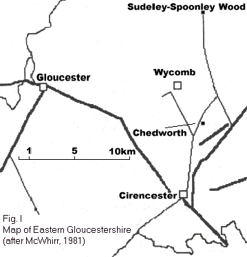 One of the wealthiest villas in Gloucestershire which does show the distinction between different groups of residents can be found at Chedworth (Fig. I). This villa (SP 052134), one of the most famous Roman sites in Britain, clearly reflects the desire of the native aristocracy for status. The reason for the location of the villa was probably the availability of water, as there was a natural spring in the north-west corner of the complex.6 The original unpretentious villa was established in the early/mid-second century (Fig. II).7 It began as three separate buildings on three sides of a courtyard and was gradually connected.8 The addition of luxurious facilities and the majority of the improvements to the villa occurred early in the fourth century AD.9 The building may have been originally built with timber in the form which it later took in stone, representing a gradual process of Romanization from form to material adaptation. Later in the century, after a destructive fire, it was replaced in an extended form with baths and more rooms (Fig. III). Features included a wealth of decorated walls, stone sculptures, mosaic floors, comfortable heated rooms and bathing facilities.10 These changes reflect the high degree of wealth of the dominant resident, as such additions were notably absent from other sections of the villa.