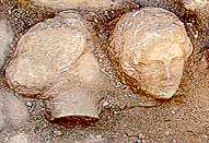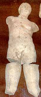 An archaic kore was unearthed on Thera (Santorini) island in November 2000. The statue, which is 2.3 m. high and weighs 750 kilos, is almost complete with only the right arm and the nose end missing.