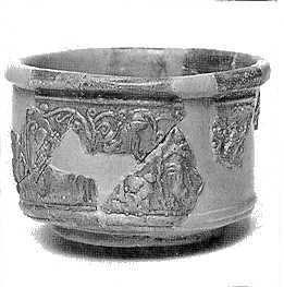 The excavator, Prof. Yiannis Lolos and his team, have just completed the excavations in the cave and have a complete picture of life in it. They found a silver ring-idol pendant which are extremely rare from Neolithic Greece although there are some made of gold (see A972. Neolithic Gold Treasure, Excavations in Athens, Argolis & Egypt ). Among various findings a roman cup of the skyphos type which measures 5.2 cm height and 8.3 cm diameter is most interesting. It was found in 18 small pieces which archaeologists made a great effort to put together. The cup is made of yellow clay and it has a relief decoration with scenes from a feast in honor of Dionysus. It must have been made in Corinth between the 2nd and the 3rd century CE and was brought to the cave by a Greek or Roman worshiper.