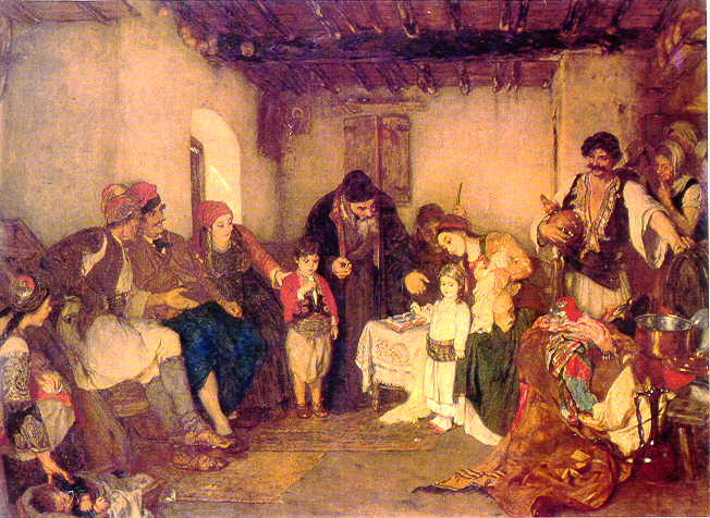 Gyzis' sojourn in Greece did not last long; Athenian artistic life was almost non existent compared to that of Munich. In 1874, Gyzis returned to Munich, this time for good. His only luggage were his memories from Greece, memories that will accompany and haunt him for the rest of his life. One of his first paintings in Munich is Engagements. It depicts the custom of engaging boys and girls at a very young age. The composition is semicircular and the monk engaging the two youths occupies the centre. The boy is already wearing the engagement ring whereas the girl has to be encouraged by her mother. On the right, we notice the presence of many everyday objects, a characteristic of Piloty's style (Lydakis 178). The design, however, has nothing to do with that of the Academy; it is more clear and, thus, more powerful. This type of design will characterize all of Gyzis' Greek genre paintings (Tsatsos 937).