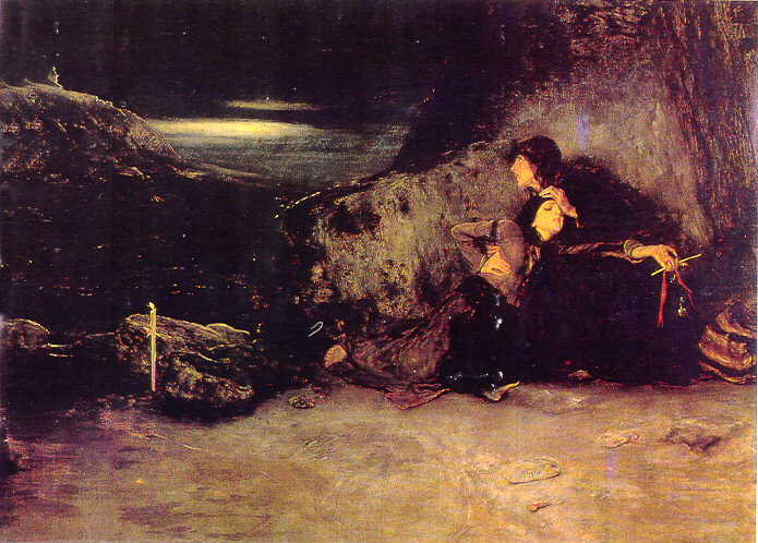One of his last genre paintings is the Offering (1886). There are two earlier versions dating, one from 1874, and the other from 1876. A girl suffering from a heart illness is taking together with her mother an offering, a golden heart to a chapel. It is not clear whether they will manage to arrive there, since the girl already exhausted has fallen into her mother's lap. The words "faith, hope, love" found at the upper right corner indicate that not everything is lost yet. The light illuminating the horizon and the distant chapel denotes the presence of God. This painting is a real masterpiece. It conveys true passion; any trace of sentimentalism is absent. Only Lytras' Psarian Bewailing can be compared to it (Lydakis 140-3).