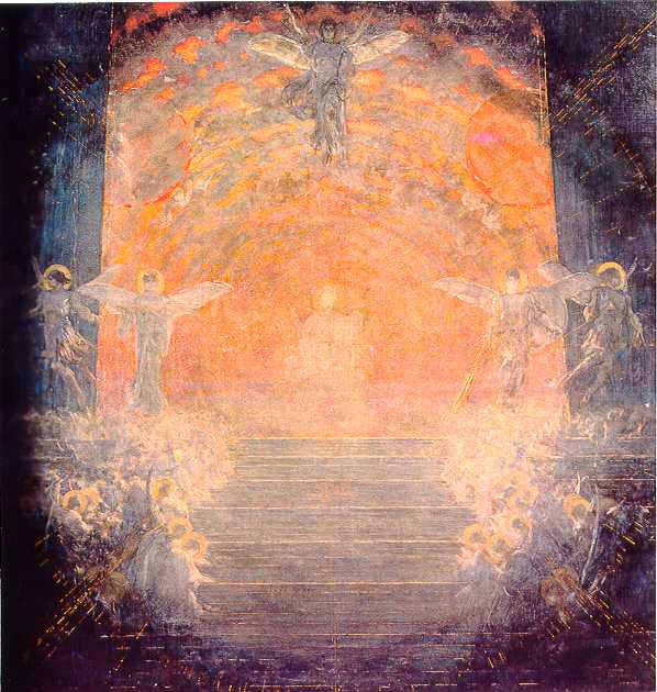 Gyzis was a deeply religious man. He believed that if one is "good", he has no reason to fear "Christ the Bridegroom coming through the darkness" (Gyzis 1953,177). During the years 1893-5, Gyzis executed many studies for the work Christ the Bridegroom (1895). This impressive work has remained unfinished (Lydakis 209). The composition is entirely symmetrical. The simplicity of design and colour further enhance the symbolism entailed by the subject matter. The incandescent "cloud" surrounding Christ renders him awe-inspiring. To all but an entirely clear conscience, this red becomes threatening, reminiscent of hell.