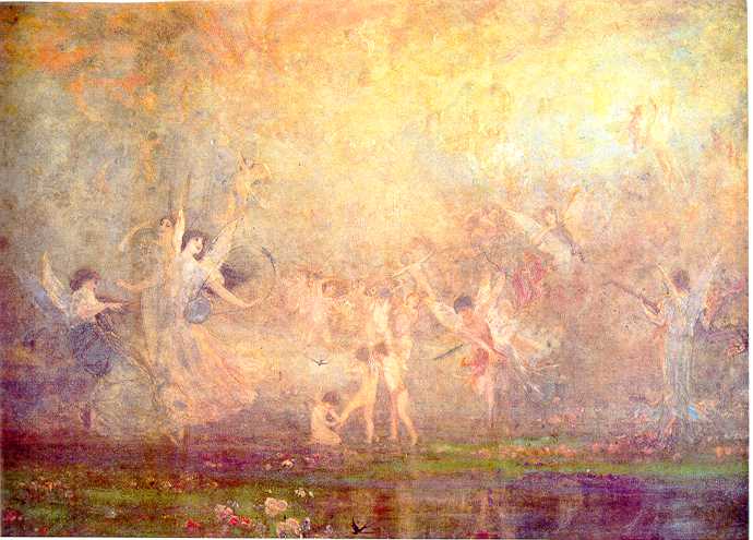 From 1886 onwards, Gyzis moved from genre to idealism. Piloty's death, which occurred the same year, could not possibly be a coincidence. The new period is inaugurated by his Pastoral Symphony (1886). Angels and putti are depicted in a very happy atmosphere, where the only sign of pain is a thorn in a putto's foot. The removal of the thorn by another putto is remnant of genre painting. This work bears the influence of Goethe's poems and Beethoven's Pastoral Symphony. The transparency of colours aims to the blending of earth and sky in a celebration of life. The refinement is so great that the composition becomes almost purely decorative (Lydakis 194-199).