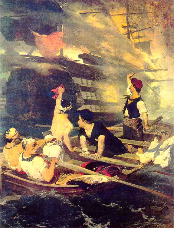 The works of the period 1872-1880 are characterized by the predominance of the warm brown yellow tone. One of them is The Setting on Fire of the Turkish Flagship by Kanaris. This constitutes Lytras' last historical composition. It is interesting to notice that even in a historical scene the emphasis is placed on the genre element. The Psarian boat with the muscular sailors occupies the foreground and dominates the scene, whereas the actual historical episode, the flagship on fire, serves as the background (Ragias 110). Here, as in the totality of his paintings, the figures play the most important role. Lytras' painting can be described as anthropocentric.