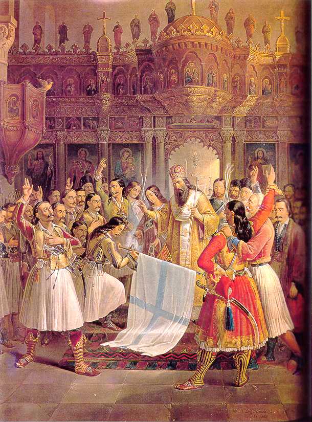 There are some smaller compositions with fewer figures. These are more romantic with warmer colours (Spiteris 274). They give the impression, though, that they are representations of a set up, assembled model. It is during this period, that the German painter Piloty used waxworks or real people in order to set up the scene he was to paint. This theatricality can be observed in Vrizakis' The Oath of the Fighters and the Blessing of the Flag by Palaion Patron Germanos (1865). The fighters are gathered around the bishop forming a semicircle, a very well known Renaissance prototype of organization. Everything is represented in great detail; notice the guns and the uniforms. For the interior of the church, Vrizakis has used as a model the Russian church of Munich (Lydakis 131).