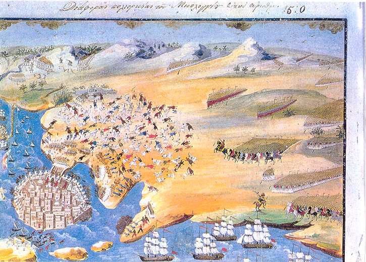 The most outstanding popular painter of the 19th c is Panayiotis Zografos. He was commissioned by General Makrygiannis to paint a set of pictures illustrating the main events of the Greek War of Independence. Makrygiannis' intent, as he explains in his memoirs, was the representation of what he considered to be the historical truth regarding the Greek revolt. Panayiotis was from Vordonia, Sparta, and the only information that we possess about him comes from Makrygiannis' memoirs. He arrived in Athens in 1836 to work entirely in Makrygiannis' house. Apparently Zografos was not his real surname; it simply denoted his profession (Ragias 16-8). Spiteris suggests that Panayiotis' technique and style point to the fact that he must have been a self-educated painter of holy pictures (155).