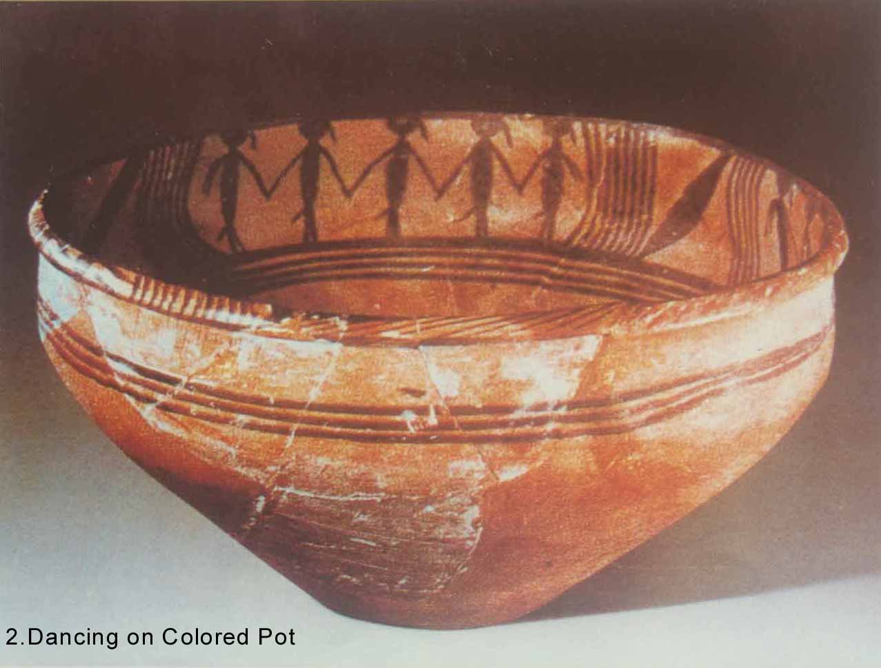 With increased knowledge of figure representation, colored paintings began to appear on pottery. Primeval religious ceremonies, often grand, provided an important subject matter. The pattern on a colored terra cotta pot unearthed from Majiayao is very telling (see pic.2), painted on which were a spectacular group dancing and singing in a very bold style. This must be a part of a religious ceremony. Looking at such art works, we must admit that the artistic efforts of the primitive human beings are immortal in a sense. It is simply incredible that rude as they appear, they still find expression in the works of the contemporary artists.