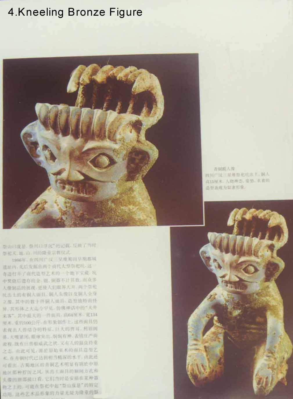 Two large underground treasure houses of the Shang Dynasty art works were found in 1986 in the relics of the capital of an old Shu State in present Sichuan province. These two pits contained numerous gold, silver and bronze articles, among which the most impressive is a suite of bronze masks, cast bronze human head and figures. Among the found bronze figures, the most remarkable, however, is probably a standing statue discovered in Guanghan, Sichuan. It was 262 centimeters in height, a real giant. Its size and fine craftsmanship win admiration from anyone who has the opportunity to see it (see pic.5). Who was represented or symbolized? Opinions are different. Some people hold that it might be a sorcerer or witchery master while the present author is inclined to assume it to be a slave owner, for in contrast the dozens of statues around it were rather tiny. This more likely suggests the rigid hierarchy of the slavery system current in that time, the slave owner being the absolute master while slaves were but zeroes.