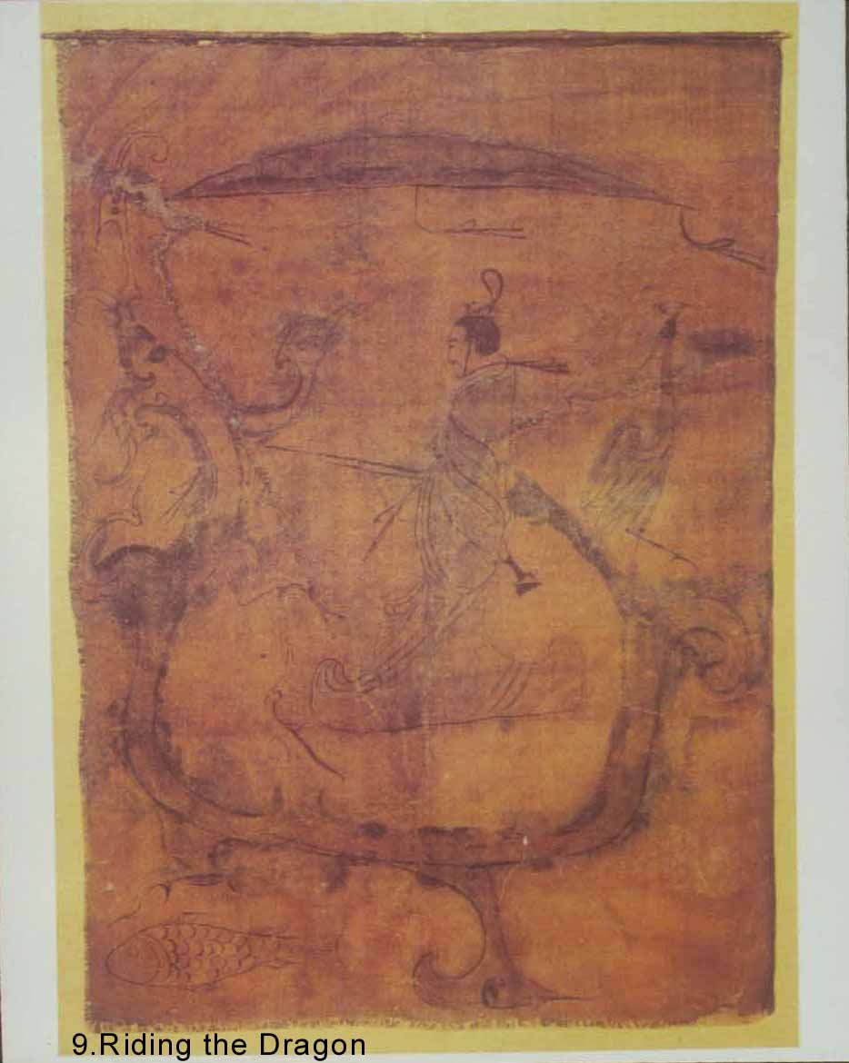 Romanticism was a particular characteristic of the culture of Chu, which was a big state during the Warring States period covering the present day Hunan province with its neighboring areas. This tradition found particular expression in the art of figure representation. In Changsha, capital of Hunan province, an archaeological site was excavated in the 1970s, where a large number of milestone findings were made in a tomb named Mawangdui No. 1. Among them was a silk painting depicting the netherworld, the mundane world, and paradise life in heaven with images of ghosts, human beings and supernatural beings. The painting vividly presented comfort in this present life, and expressed hope for greater happiness in the imaginary next world. Two silk paintings unearthed from an ancient tomb in the same area are worth mentioning, too. One is "Dragon, Phoenix and Woman" (see pic.8), and the other is "Riding the Dragon" (see pic.9). In Chinese the phoenix, regarded as female, is always matched with the dragon representing the male. As in the past they were equivalents of most noble persons but also considered divinities, it needed originality to imagine mounting a human man on back of a dragon!
