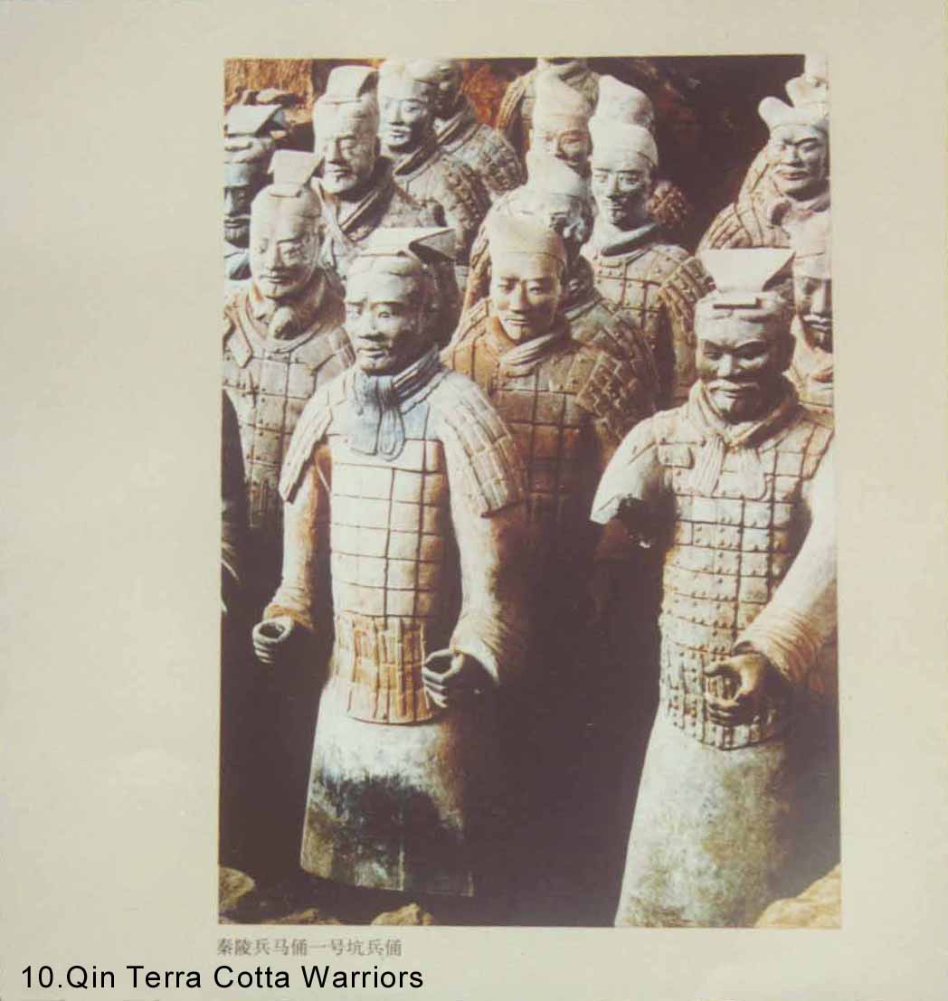 In 221 BC China saw the end of the Warring States period, which was followed by unification of the country after centuries' splitting. The newly founded empire was the Qin Dynasty (221-207 BC), a very powerful dynasty. Though short-lived, it accomplished a series of remarkable feats, one of which, for instance, was the building of the Great Wall. It was during the Qin that the greatest event in the history of the art of figure characterization and representation occurred. In 1974 a chance finding of a terra cotta figure led to eventual excavation of a tiny fraction of the mausoleum of Qinshihuang, the first emperor of the Qin dynasty. The excavated part consisted of pits of terra-cotta warriors and steeds (see pic.10). The warriors were made as the imperial garrison of Qinshihuang Mausoleum. This has been hailed as one of the world's most spectacular archaeological findings in the twentieth century.