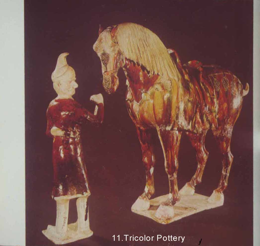 Pottery figurines, known as Tang Tricolor Glaze (see pic.11), were the hallmark of excellent figure making techniques of the period. The tricolor glaze is a general term for colored glazed pottery figurines, suggesting that the figurines were mainly tinted in three basic colors of white, yellow, and green, whereas prior to the Tang Dynasty only blue and black had occasionally been used on the glazed figurines.