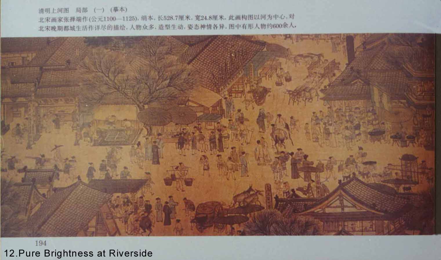 A painting Pure Brightness Festival at the Riverside (see pic.12) by Zhang Zeduan of the Northern Song Dynasty is a fine example of the Chinese school of secular painting. Covering a silk scroll measuring 5.287 meters long it represents in a realistic way a multitude of people from all walks of life in the Northern Song capital, Bianliang (today's Kaifeng, Henan province) during the twelfth century. In the picture there are about six hundred figures including officials, peasants, physicians, traders, gentry, bailiffs, actors, fortune-tellers, Buddhist monks, Taoist priests, women, children, prostitutes, servants, and what not. The majority of them were laborers, who wore kerchiefs, rain hats and shorts, coats unbuttoned with the sleeves rolled up. Though the same class, they were of various trades, porters, cart drivers, sedan chair bearers, carpenters, blacksmiths, boat trackers, and boatsmen. No figure is bigger than three centimeters high, the smallest one but one centimeter, but all of the characters are depicted true to life with lively expressions, from which you can see their emotions. It is a lively and vigorous sight that so many people are crowded in one single painting, some riding horses or donkeys, some sitting on sedan chairs, some strolling in the fields, some visiting ancestors' tombs, some leaning against the railings to enjoy the panorama of the city, some drinking, some chatting, some bargaining, some reciting ballads, some pushing boats with long poles, some pulling at carts, some loading and unloading carts, some begging alms.