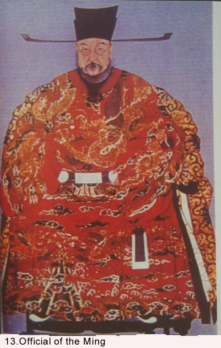 In paintings of the Ming we can see that the black gauze cap was the common headgear, its crown made lower in the front and higher at the back with a wing attached to each side of the cap so as to create a smooth silhouette. The black gauze caps and round-collar robes with serpentine patterns and cotton waistbands became the typical outfit of the Ming emperors and officials (see pic.13). Different ranks of the Ming officials were marked by the difference in color and fabric of the robes, quality of the waistbands, and decorations of the clothing. Women of the Ming Dynasty were dressed in a style similar to that of the Song Dynasty, and they were used to wearing head ribbons, which were known as forehead bands.