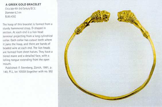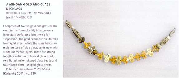 The oldest piece of jewelry in the Borowski collection comes from Crete, dating to the Late Bronze Age. The island of Crete was first in developing a civilization in Europe (the Minoan civilization)(1) which encouraged the fashion for ornamented gold jewelry. The Minoan pendants, rings and earrings had remarkable designs, often based on animal figures, in naturalistic or heraldic style. Necklaces were strung with pendant beans designed in the form of a lily; some of the gold necklaces were interspersed with beaded rock crystals and spherical glass beads in graduated sizes.