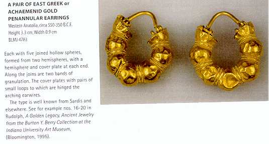 Following the destruction of the Mycanaean cities by invading Dorians during the early Iron Age (circa 1100 - 800 BC.) (2) Grecian art reached a low ebb. Jewelry was rare, and the few pieces uncovered at sites consisted of strips of gold wire bent to make finger rings, diadems, earrings or bracelets.