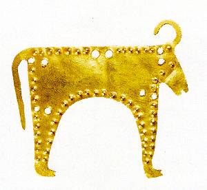 What is striking about the Varna cemetery is the splendor and variety of the gold objects discovered in the graves. The sheer amount of gold found is astonishing - a total weight of over six kilograms, comprising more than 38 different kinds of objects unique to Varna. The gold is very pure - (23.5 carat) and experts are still unable to agree on its source. Although most of the artifacts were produced by heating and hammering the metal, new evidence suggest that some were molded, and even cast using the 'lost wax' technique. These advances in goldsmith were forgotten with the destruction of Varna civilization, and it would be another 2,000 years before gold objects were again crafted in the region. |