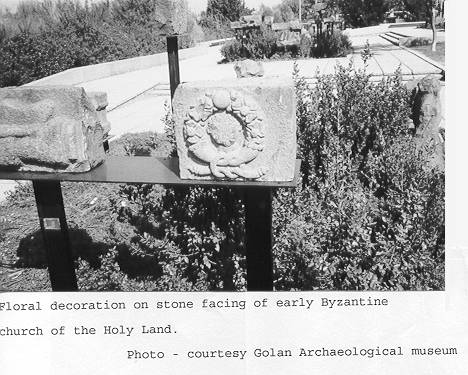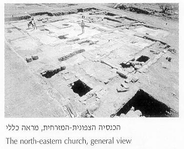 THE CHURCHES OF KHIRBET CASTRA. Two churches had been uncovered, each with a colored mosaic floor with geometric and floral motifs, a baptismal font, and a reliquary. Capitals, lintels and bars of the churches were decorated with crosses, geometric patterns and plant forms, and with other architectural elements. The first church builders, the Byzantines were careful not to incorporate pagan motifs, and limited themselves to these geometric and plant forms. Only as of the mid-fifth century AD are living people and creatures depicted. From archeological evidence it is possible to present the architecture of the early Christian churches. They are of the basilica type, a rectangle divided by rows of pillars into three areas. The central area, the knave, is higher than the aisles on either side. The double slope of the roof is usually constructed of wooden beams and tiles. The eastern wall ends in a semi-circular apse covered by a half-dome.