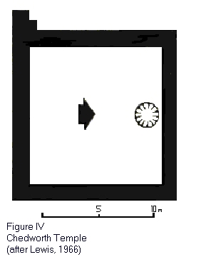 A Romano-Celtic temple has also been discovered at Chedworth (Fig. IV). This temple is located around 800 meters south-east of the villa complex, on a hillside near the Coln River. The temple was roughly square in shape, with a portico of 15.5 meters by 15 meters.12 A pit, probably votive in function, was discovered within the ambulatory of the temple,13 producing human remains and the bones of a red deer.