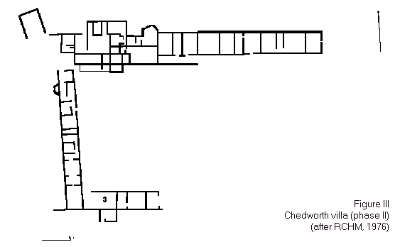 One of the wealthiest villas in Gloucestershire which does show the distinction between different groups of residents can be found at Chedworth (Fig. I). This villa (SP 052134), one of the most famous Roman sites in Britain, clearly reflects the desire of the native aristocracy for status. The reason for the location of the villa was probably the availability of water, as there was a natural spring in the north-west corner of the complex.6 The original unpretentious villa was established in the early/mid-second century (Fig. II).7 It began as three separate buildings on three sides of a courtyard and was gradually connected.8 The addition of luxurious facilities and the majority of the improvements to the villa occurred early in the fourth century AD.9 The building may have been originally built with timber in the form which it later took in stone, representing a gradual process of Romanization from form to material adaptation. Later in the century, after a destructive fire, it was replaced in an extended form with baths and more rooms (Fig. III). Features included a wealth of decorated walls, stone sculptures, mosaic floors, comfortable heated rooms and bathing facilities.10 These changes reflect the high degree of wealth of the dominant resident, as such additions were notably absent from other sections of the villa.