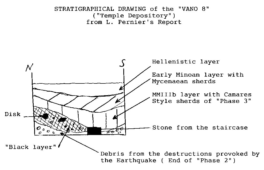 Moreover, the Proto-Ionian decipherment of the Disk (See Faucounau 1999) and the work of F. Carinci (See Aegeum 3, pp.73-80) have allowed us to reconstruct the history of the "Vano 8" as follows: From its architectural characteristics, it has been established that this underground room was a "Temple Repository" (cf Pernier, Platon, Alexiou, etc.). It is in this basement that the Proto-Ionian Disk (coming from a tomb or a mortuary temple, pillaged by the Minoans in a Cycladic island) has been storaged as a trophy, with diverse precious items. When the Earthquake happened at the end of "Phase 2" (following F. Carinci's definition), the building above the Temple Repository was destroyed. A few days after the Earthquake, the Minoans sent a crew to clear up the room and to recover the precious objects. During this operation, the workers had their meals on the spot, so creating this "black layer" with charcoal, ashes and bovine bones, in which the Disk and the Linear A tablet PH 1 were found. The Disk, which had been discovered by the Minoan workers amongst the plaster debris, fallen from the ceiling and walls, was apparently discarded as worthless, and thrown into the "black layer" of ashes.